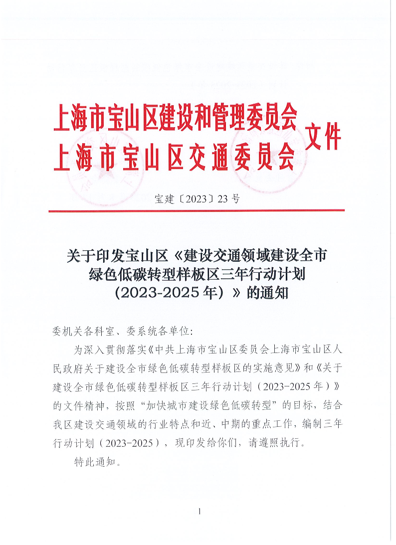 关于印发宝山区《建设交通领域建设全市绿色低碳转型样板区三年行动计划(2023-2025年)》的通知