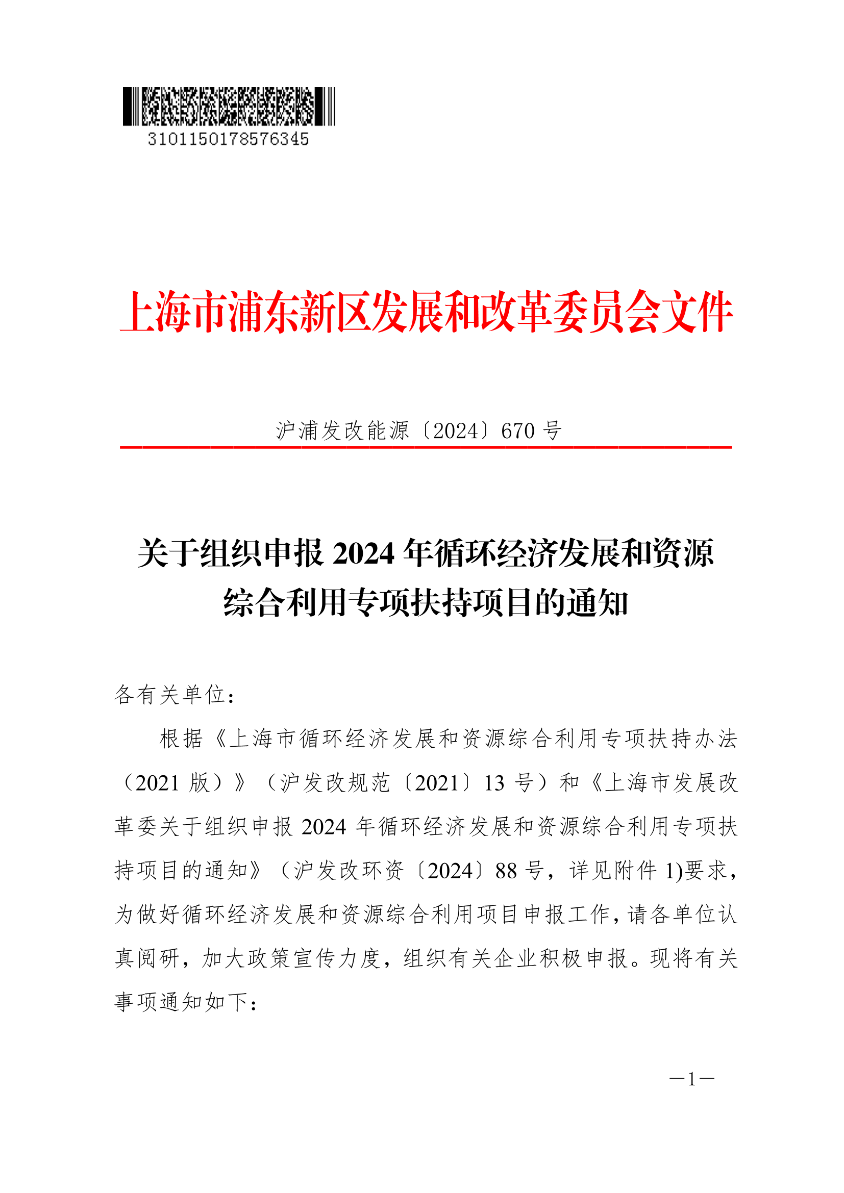 1.《上海市发展改革委关于组织申报2024年循环经济发展和资源综合利用专项扶持项目的通知》(沪发改环资〔2024〕88号)