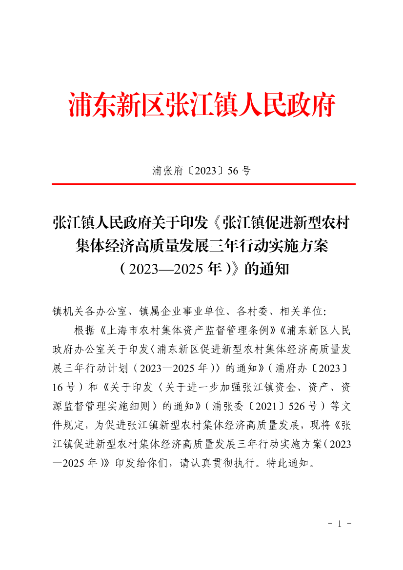 根据《上海市农村集体资产监督管理条例》《浦东新区人民政府办公室关于印发〈浦东新区促进新型农村集体经济高质量发展三年行动计划(2023-2025年)〉的通知》(浦府办〔2023〕16号)和《关于印发〈关于进一步加强张江镇资金、资产、资源监督管理实施细则〉的通知》(浦张委〔2021〕526号)等文件规定,为促进张江镇新型农村集体经济高质量发展,现将《张江镇促进新型农村集体经济高质量发展三年行动实施方案(2023—2025年)》印发给你们,请认真贯彻执行。特此通知。