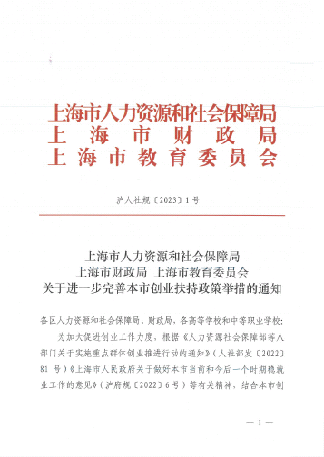 为加大促进创业工作力度,根据《人力资源社会保障部等八部门关于实施重点群体创业推进行动的通知》(人社部发〔2022〕81号)《上海市人民政府关于做好本市当前和今后一个时期稳就业工作的意见》(沪府规〔2022〕6号)等有关精神,结合本市创业工作实际,现就进一步完善本市创业扶持政策有关事项通知如下: