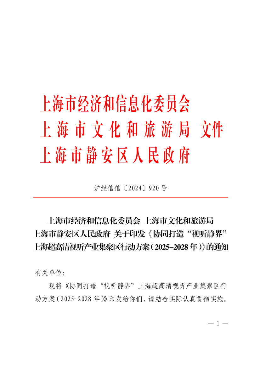 现将《协同打造“视听静界”上海超高清视听产业集聚区行动方案(2025-2028年)》印发给你们,请结合实际认真贯彻实施。