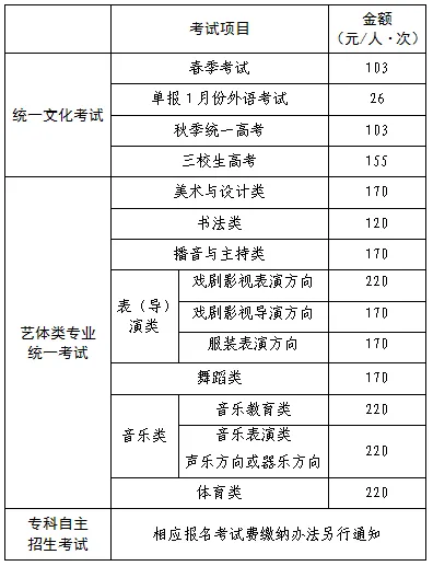 根据《关于上海市教育考试院有关考试收费等问题的复函》(沪价费〔2006〕005号)、《关于调整上海市教育考试院外语口语考试等收费标准的复函》(沪价费〔2003〕069号)文件规定,文化考试收费标准:报名费为每项考试25元/人(专科自主招生报名考试费另行通知),考试费为每项考试每科目26元/人;艺体类专业考试收费标准:报名费为每项考试20元/人,考试费为每项考试每科目50元/人。各类考试项目须缴纳费用如下表所示: