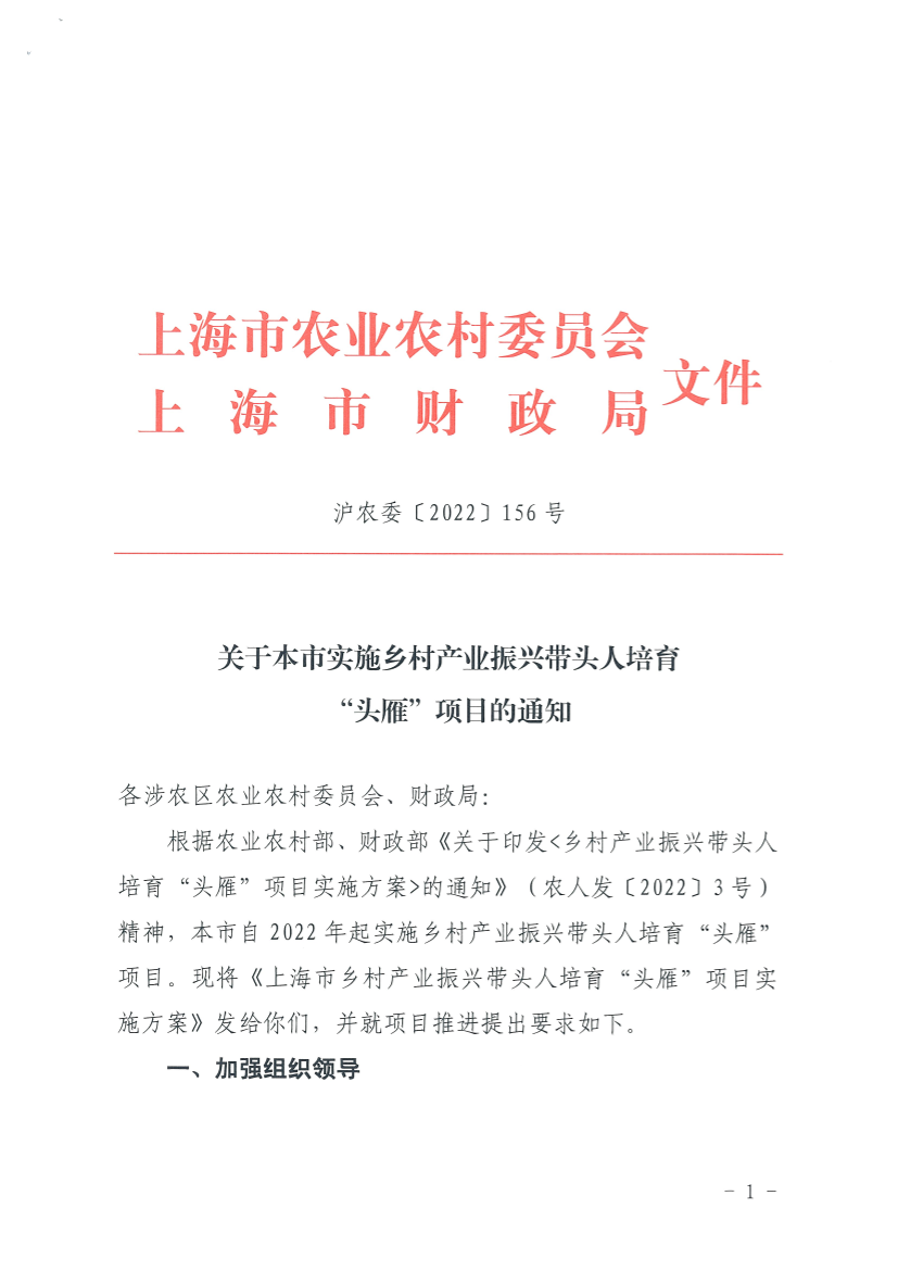 1. 上海市乡村产业振兴带头人培育“头雁”项目实施方案
