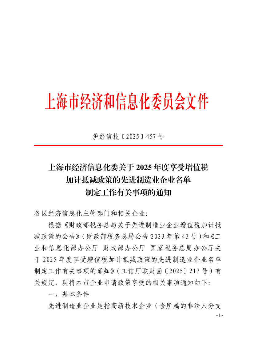 根据《财政部税务总局关于先进制造业企业增值税加计抵减政策的公告》(财政部税务总局公告2023年第43号)和《工业和信息化部办公厅 财政部办公厅 国家税务总局办公厅关于2025年度享受增值税加计抵减政策的先进制造业企业名单制定工作有关事项的通知》(工信厅联财函〔2025〕217号)有关规定,现将本市企业申请政策享受的相关事项通知如下: