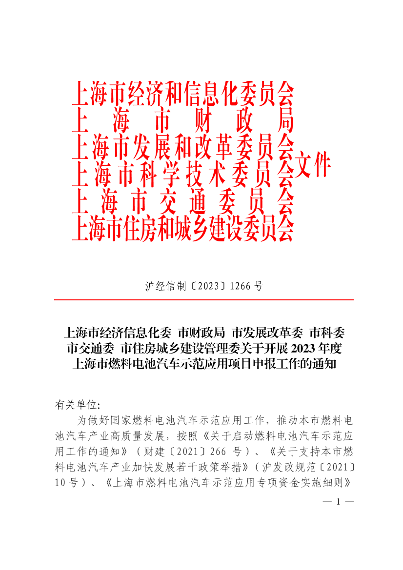 为做好国家燃料电池汽车示范应用工作,推动本市燃料电池汽车产业高质量发展,按照《关于启动燃料电池汽车示范应用工作的通知》(财建〔2021〕266号)、《关于支持本市燃料电池汽车产业加快发展若干政策举措》(沪发改规范〔2021〕10号)、《上海市燃料电池汽车示范应用专项资金实施细则》(沪经信规范〔2023〕2 号)等文件精神,现就开展2023年度上海市燃料电池汽车示范应用项目申报工作的有关事项通知如下: