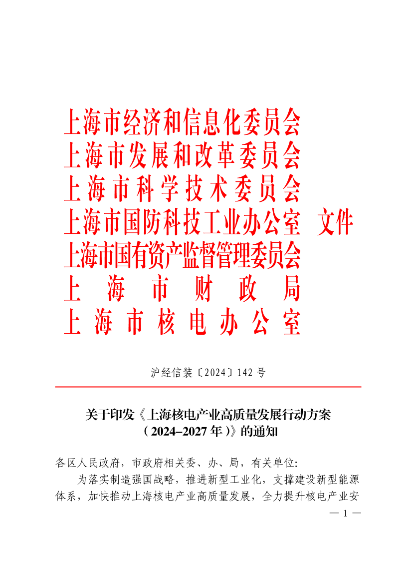 为落实制造强国战略,推进新型工业化,支撑建设新型能源体系,加快推动上海核电产业高质量发展,全力提升核电产业安全性、先进性以及竞争力、引领力,经市政府同意,现将《上海核电产业高质量发展行动方案(2024-2027年)》印发给你们,请认真实施。