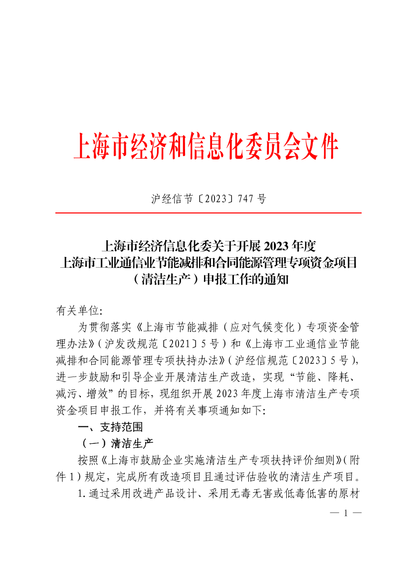为贯彻落实《上海市节能减排(应对气候变化)专项资金管理办法》(沪发改规范〔2021〕5号)和《上海市工业通信业节能减排和合同能源管理专项扶持办法》(沪经信规范〔2023〕5号),进一步鼓励和引导企业开展清洁生产改造,实现“节能、降耗、减污、增效”的目标,现组织开展2023年度上海市清洁生产专项资金项目申报工作,并将有关事项通知如下: