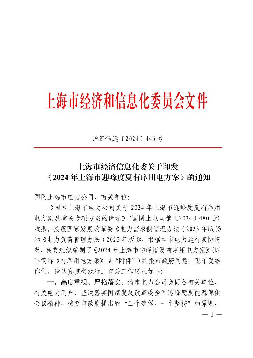 《国网上海市电力公司关于2024年上海市迎峰度夏有序用电方案及有关专项方案的请示》(国网上电司销〔2024〕480号)收悉。按照国家发展改革委《电力需求侧管理办法(2023年版)》和《电力负荷管理办法(2023年版)》,根据本市电力运行实际情况,我委组织编制了《2024年上海市迎峰度夏有序用电方案》(以下简称《有序用电方案》见“附件”)并报市政府同意,现印发给你们,请认真贯彻执行。有关工作要求如下: