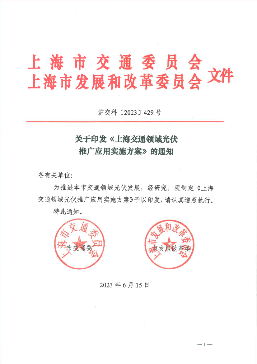 上海市交通委员会、上海市发展和改革委员会关于印发《上海交通领域光伏推广应用实施方案》的通知