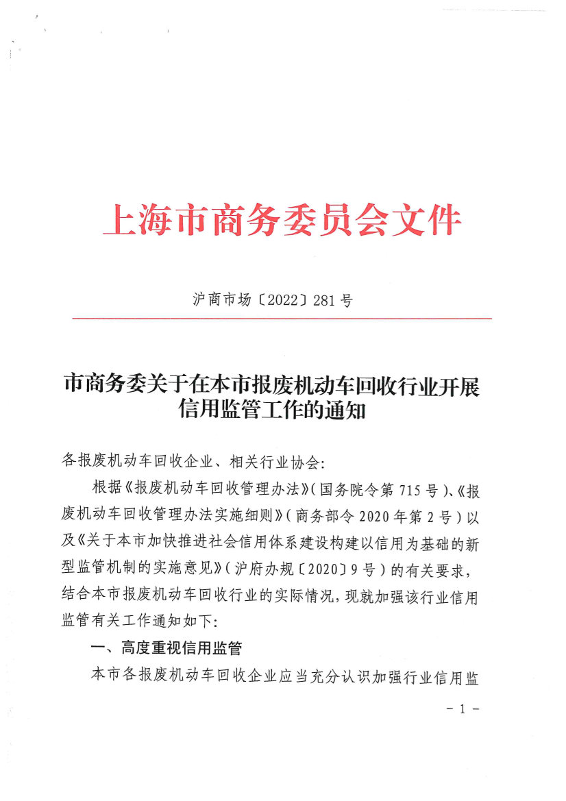 根据《报废机动车回收管理办法》(国务院令第715号)、《报废机动车回收管理办法实施细则》(商务部令2020年第2号)以及《关于本市加快推进社会信用体系建设构建以信用为基础的新型监管机制的实施意见》(沪府办规〔2020〕9号)的有关要求,结合本市报废机动车回收行业的实际情况,现就加强该行业信用监管有关工作通知如下: