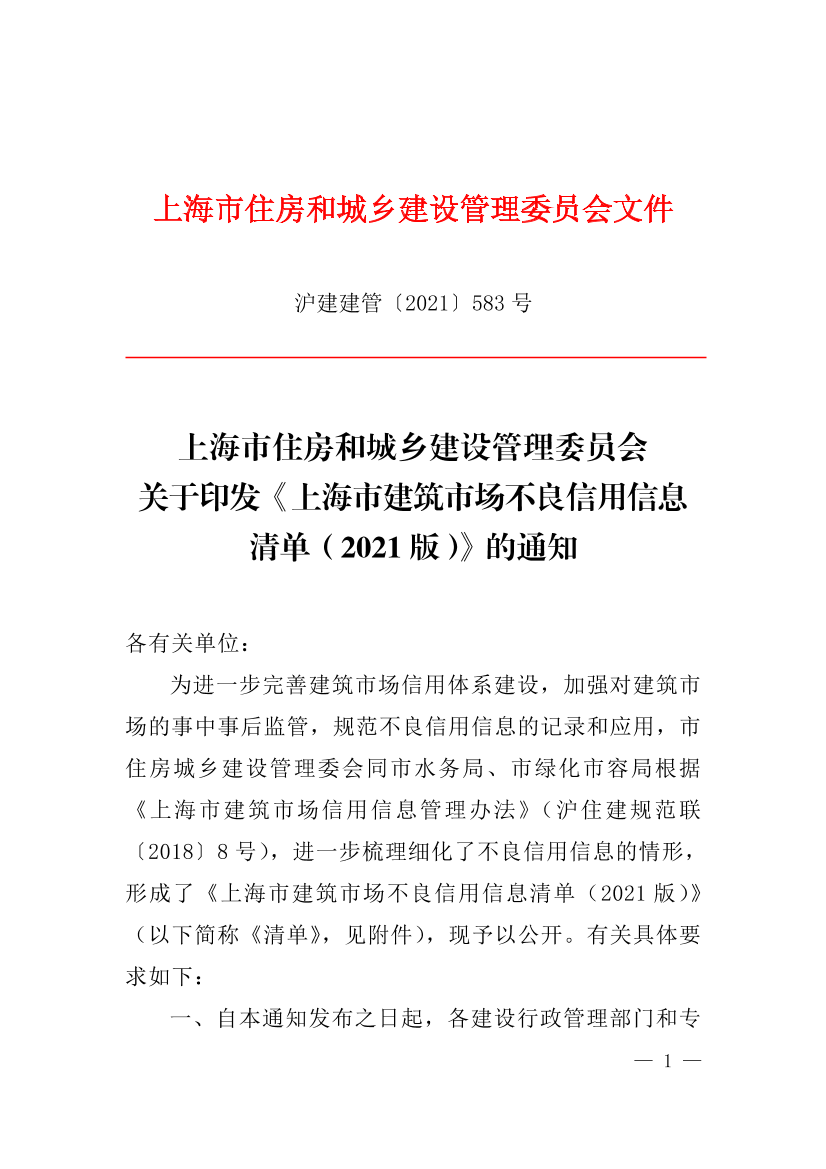 关于印发《上海市建筑市场不良信用信息清单(2021版)》的通知