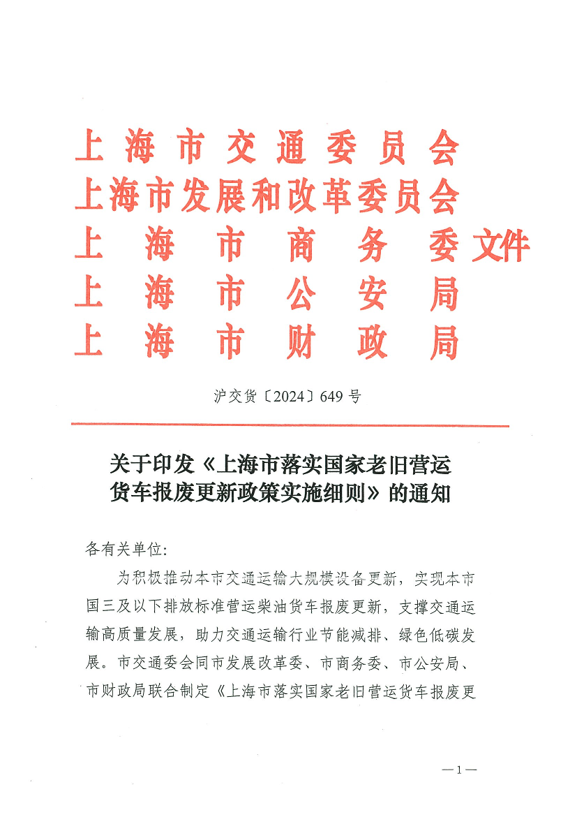 为积极推动本市交通运输大规模设备更新,实现本市国三及以下排放标准营运柴油货车报废更新,支撑交通运输高质量发展,助力交通运输行业节能减排、绿色低碳发展。市交通委会同市发展改革委、市商务委、市公安局、市财政局联合制定《上海市落实国家老旧营运货车报废更新政策实施细则》,现予发布,请认真贯彻执行。