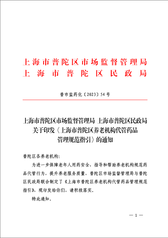 为进一步保障老年人用药安全,指导和帮助养老机构规范药品代管行为,提升养老服务质量,普陀区市场监督管理局与普陀区民政局联合制定了《上海市普陀区养老机构代管药品管理规范指引》,现印发给你们,请积极落实。