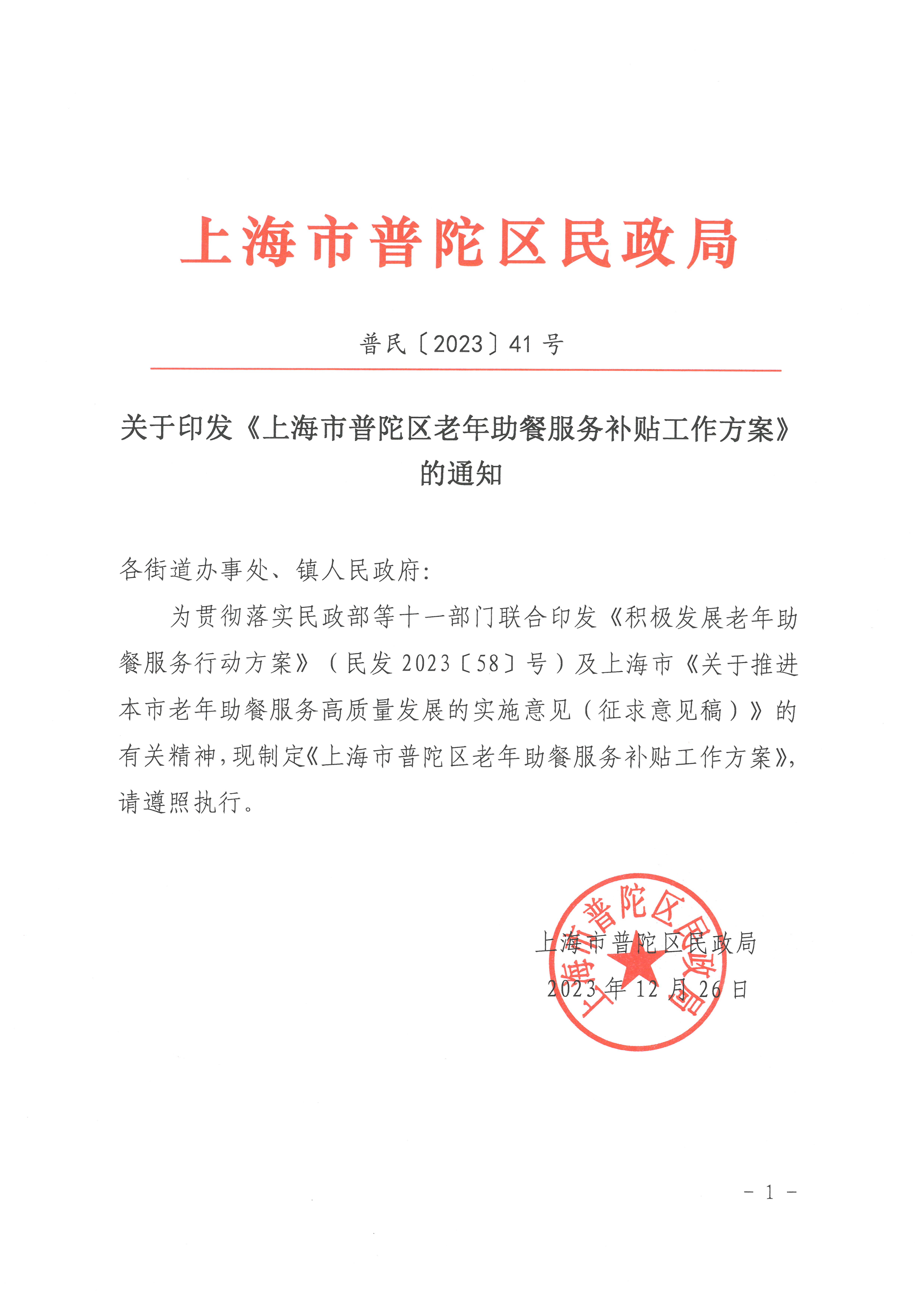 为贯彻落实民政部等十一部门联合印发《积极发展老年助餐服务行动方案》(民发2023〔58〕号)及上海市《关于推进本市老年助餐服务高质量发展的实施意见(征求意见稿)》的有关精神,现制定《上海市普陀区老年助餐服务补贴工作方案》,请遵照执行。