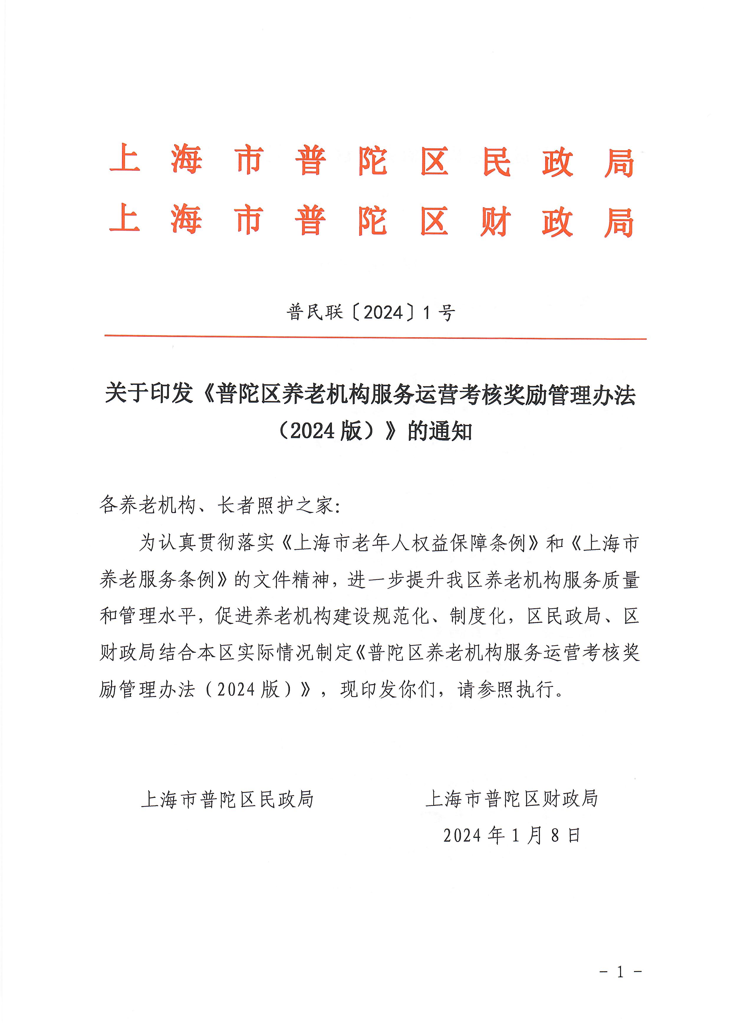 为认真贯彻落实《上海市老年人权益保障条例》和《上海市养老服务条例》的文件精神,进一步提升我区养老机构服务质量和管理水平,促进养老机构建设规范化、制度化,区民政局、区财政局结合本区实际情况制定《普陀区养老机构服务运营考核奖励管理办法(2024版)》,现印发你们,请参照执行。