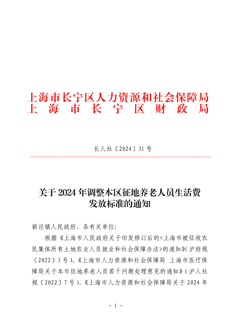 根据《上海市人民政府关于印发修订后的<上海市被征收农民集体所有土地农业人员就业和社会保障办法>的通知》(沪府规〔2022〕3号)、《上海市人力资源和社会保障局 上海市医疗保障局关于本市征地养老人员若干问题处理意见的通知》(沪人社规〔2022〕7号)、《上海市人力资源和社会保障局关于2024年调整本市征地养老人员生活费标准的通知》(沪人社规〔2024〕12号)和《关于印发修订后的<长宁区征地养老人员区级统筹管理办法>的通知》(长人社〔2022〕17号)的精神,经区政府同意,从2024年1月1日起调整本区征地养老人员生活费,现就有关事项通知如下: