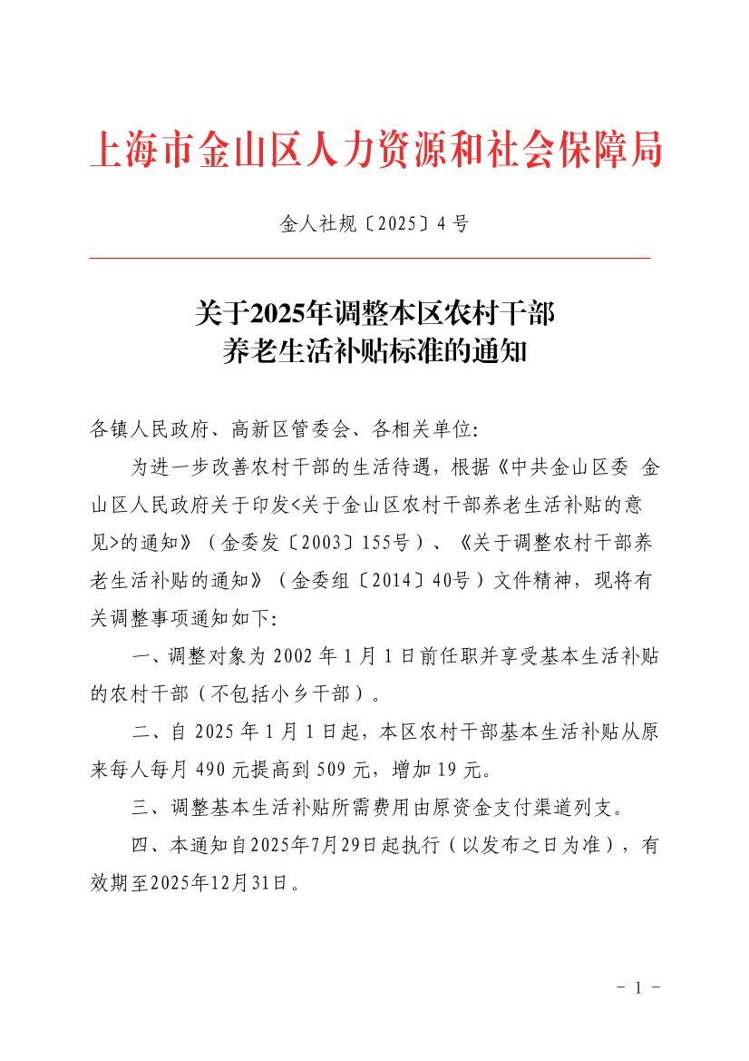 二、自2025年1月1日起,本区农村干部基本生活补贴从原来每人每月490元提高到509元,增加19元。