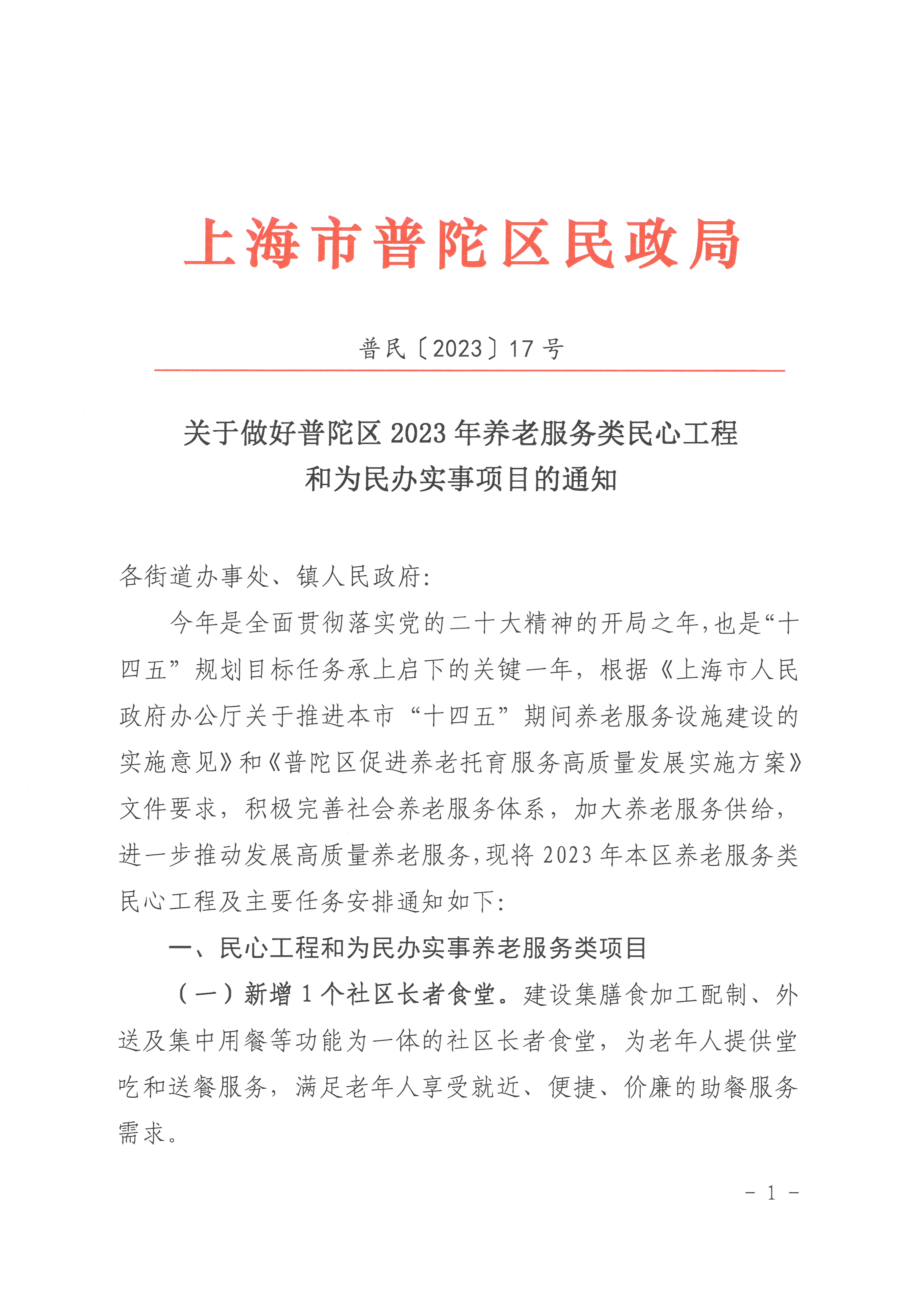 今年是全面贯彻落实党的二十大精神的开局之年,也是“十四五”规划目标任务承上启下的关键一年,根据《上海市人民政府办公厅关于推进本市“十四五”期间养老服务设施建设的实施意见》和《普陀区促进养老托育服务高质量发展实施方案》文件要求,积极完善社会养老服务体系,加大养老服务供给,进一步推动发展高质量养老服务,现将2023年本区养老服务类民心工程及主要任务安排通知如下:
