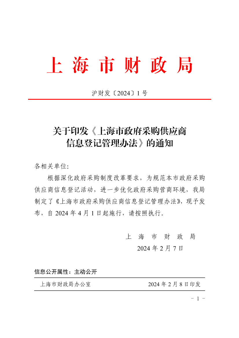 根据深化政府采购制度改革要求,为规范本市政府采购供应商信息登记活动,进一步优化政府采购营商环境,我局制定了《上海市政府采购供应商信息登记管理办法》,现予发布,自2024年4月1日起施行,请按照执行。