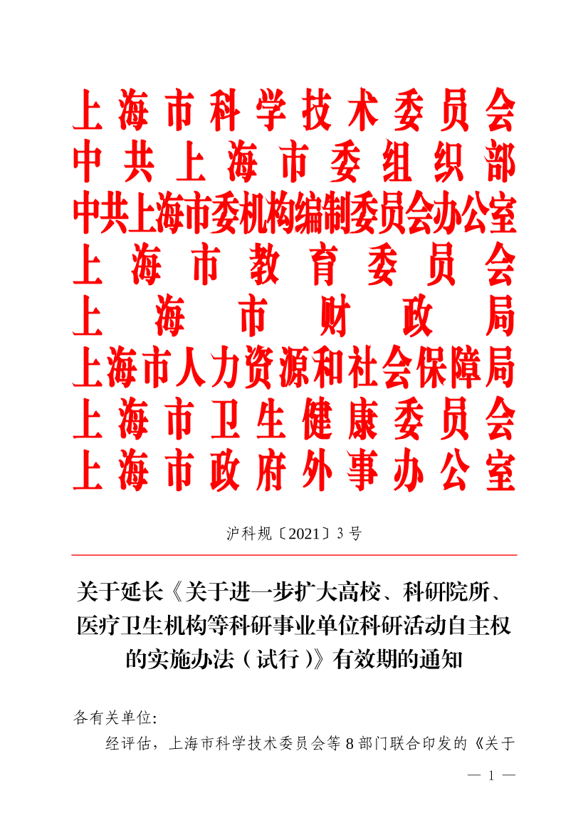 经评估,上海市科学技术委员会等8部门联合印发的《关于进一步扩大高校、科研院所、医疗卫生机构等科研事业单位科研活动自主权的实施办法(试行)》(沪科规〔2019〕2号)需继续实施,有效期延长至2023年4月19日。