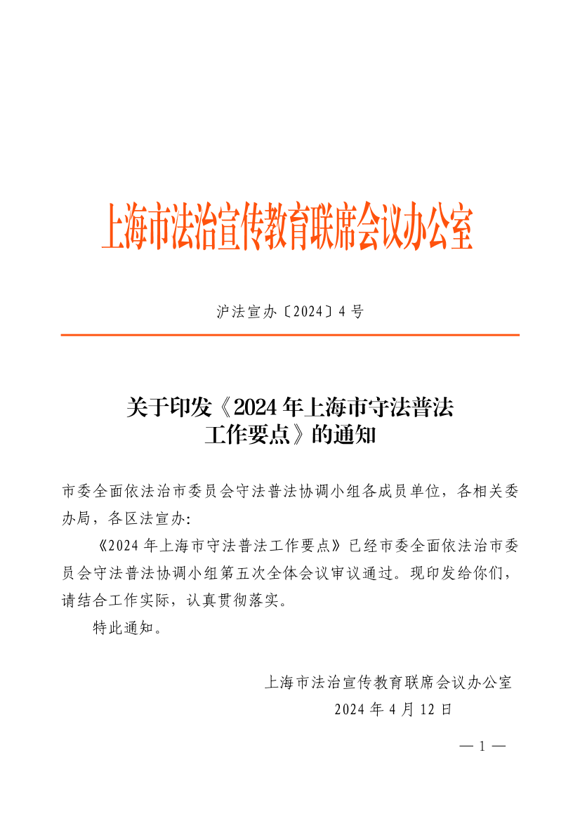 《2024年上海市守法普法工作要点》已经市委全面依法治市委员会守法普法协调小组第五次全体会议审议通过。现印发给你们,请结合工作实际,认真贯彻落实。