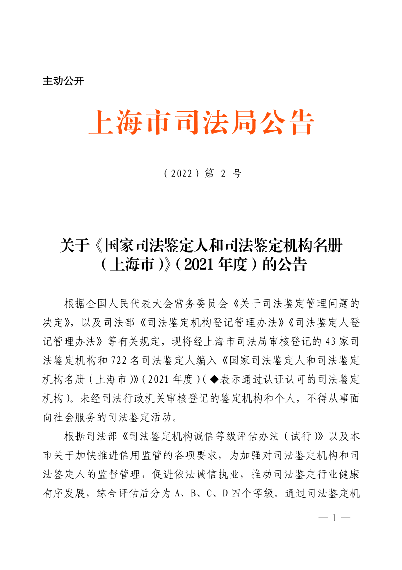 根据全国人民代表大会常务委员会《关于司法鉴定管理问题的决定》,以及司法部《司法鉴定机构登记管理办法》《司法鉴定人登记管理办法》等有关规定,现将经上海市司法局审核登记的43家司法鉴定机构和722名司法鉴定人编入《国家司法鉴定人和司法鉴定机构名册(上海市)》(2021年度)(◆表示通过认证认可的司法鉴定机构)。未经司法行政机关审核登记的鉴定机构和个人,不得从事面向社会服务的司法鉴定活动。