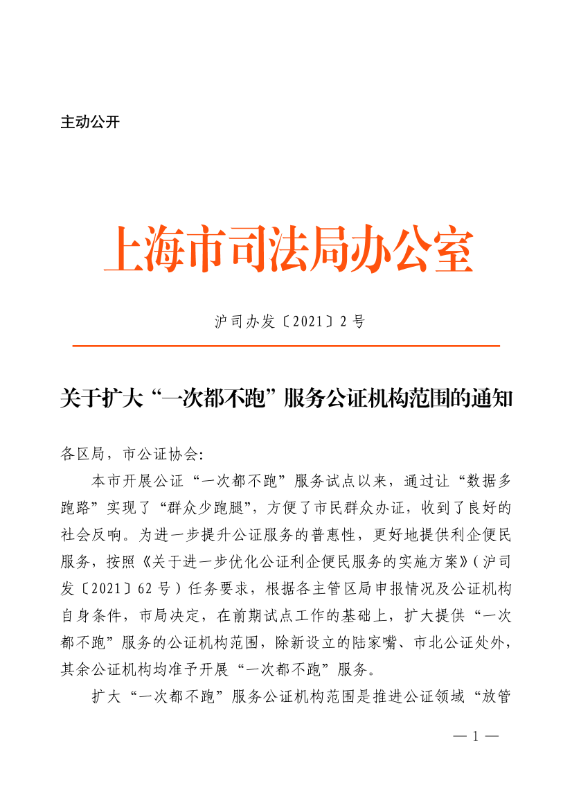 本市开展公证“一次都不跑”服务试点以来,通过让“数据多跑路”实现了“群众少跑腿”,方便了市民群众办证,收到了良好的社会反响。为进一步提升公证服务的普惠性,更好地提供利企便民服务,按照《关于进一步优化公证利企便民服务的实施方案》(沪司发〔2021〕62号)任务要求,根据各主管区局申报情况及公证机构自身条件,市局决定,在前期试点工作的基础上,扩大提供“一次都不跑”服务的公证机构范围,除新设立的陆家嘴、市北公证处外,其余公证机构均准予开展“一次都不跑”服务。