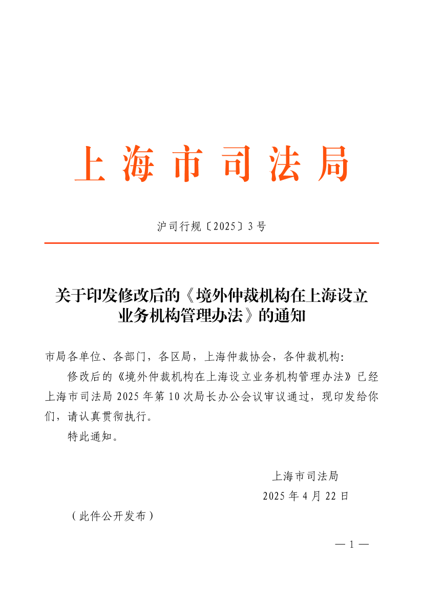 修改后的《境外仲裁机构在上海设立业务机构管理办法》已经上海市司法局2025年第10次局长办公会议审议通过,现印发给你们,请认真贯彻执行。