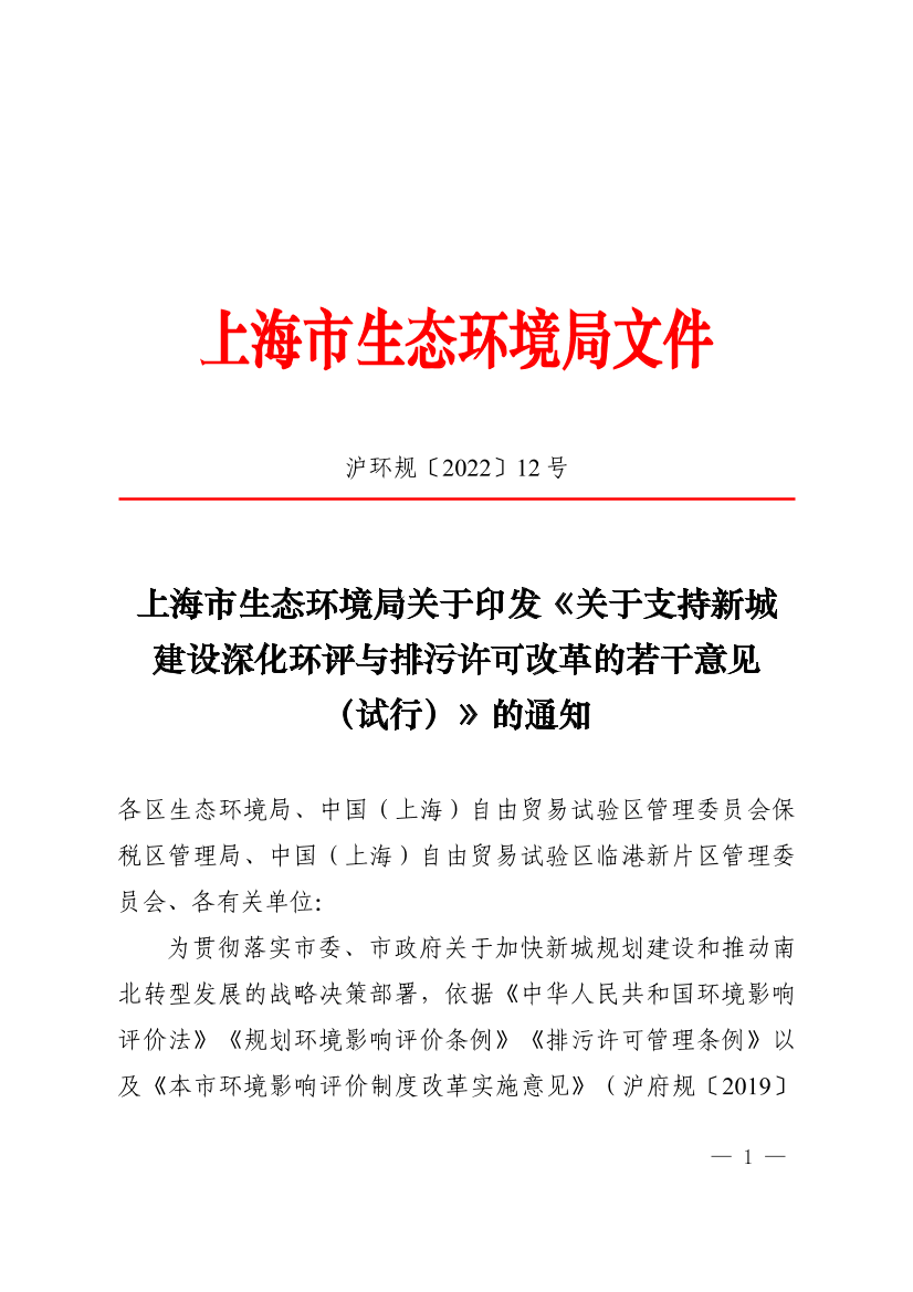 为贯彻落实市委、市政府关于加快新城规划建设和推动南北转型发展的战略决策部署,依据《中华人民共和国环境影响评价法》《规划环境影响评价条例》《排污许可管理条例》以及《本市环境影响评价制度改革实施意见》(沪府规〔2019〕24号)的有关规定,结合实际,我局研究制定了《关于支持新城建设深化环评与排污许可改革的若干意见(试行)》,现印发给你们,请认真按照执行。