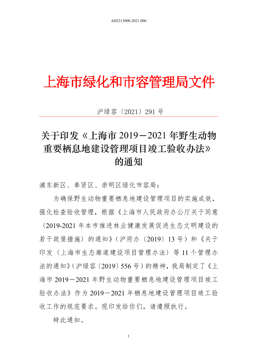关于印发《上海市2019-2021年野生动物重要栖息地建设管理项目竣工验收办法》的通知