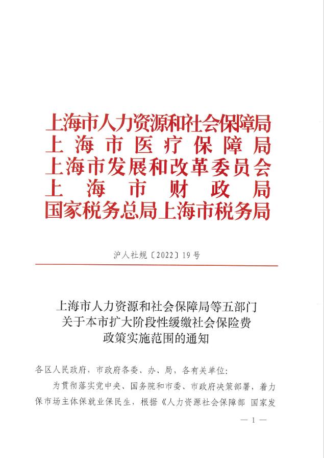 为贯彻落实党中央、国务院和市委、市政府决策部署,着力保市场主体保就业保民生,根据《人力资源社会保障部 国家发展改革委 财政部 税务总局关于扩大阶段性缓缴社会保险费政策实施范围等问题的通知》(人社部发〔2022〕31号)要求,经市政府同意,本市在继续实施《上海市人力资源和社会保障局等四部门关于本市特困行业阶段性实施缓缴企业社会保险费政策的通知》(沪人社规〔2022〕15号)的基础上,扩大缓缴政策实施范围,延长缓缴政策实施期限。现就有关事项通知如下: