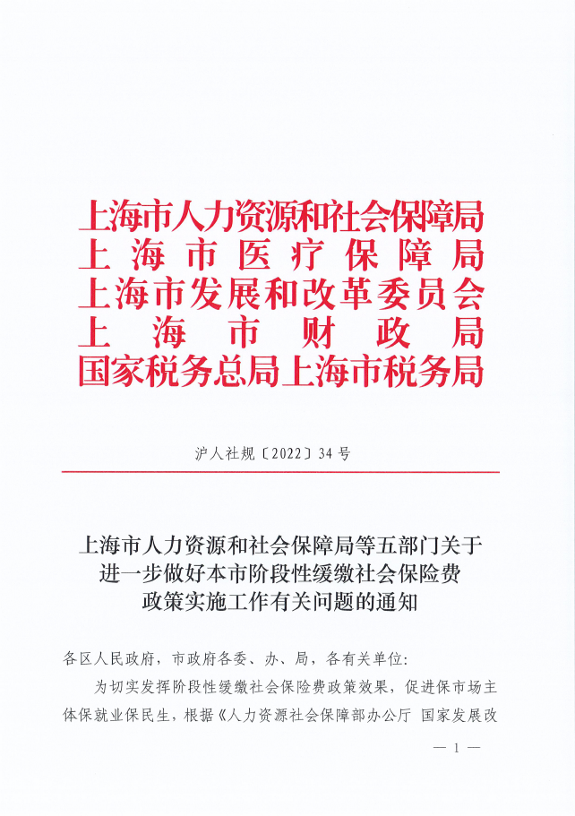 为切实发挥阶段性缓缴社会保险费政策效果,促进保市场主体保就业保民生,根据《人力资源社会保障部办公厅国家发展改革委办公厅财政部办公厅国家税务总局办公厅关于进一步做好阶段性缓缴社会保险费政策实施工作有关问题的通知》(人社厅发〔2022〕50号)要求,经市政府同意,本市在落实好《上海市人力资源和社会保障局等四部门关于本市特困行业阶段性实施缓缴企业社会保险费政策的通知》(沪人社规〔2022〕15号)、《上海市人力资源和社会保障局等五部门关于本市扩大阶段性缓缴社会保险费政策实施范围的通知》(沪人社规〔2022〕19号)等文件的基础上,调整阶段性缓缴社会保险费的用人单位补缴费款期限。现就有关事项通知如下: