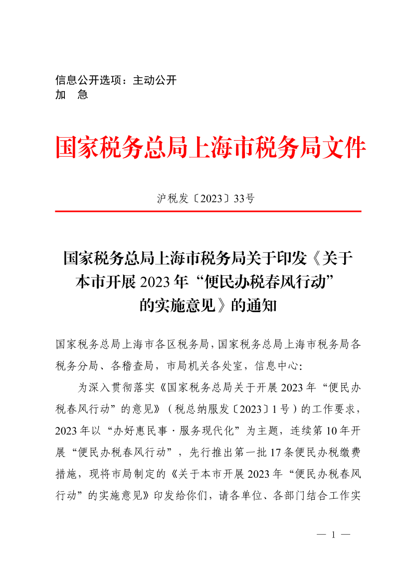 为深入贯彻落实《国家税务总局关于开展2023年“便民办税春风行动”的意见》(税总纳服发〔2023〕1号)的工作要求,2023年以“办好惠民事·服务现代化”为主题,连续第10年开展“便民办税春风行动”,先行推出第一批17条便民办税缴费措施,现将市局制定的《关于本市开展2023年“便民办税春风行动”的实施意见》印发给你们,请各单位、各部门结合工作实际遵照执行。