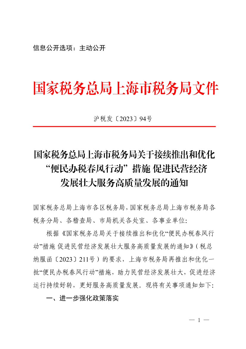 根据《国家税务总局关于接续推出和优化“便民办税春风行动”措施 促进民营经济发展壮大服务高质量发展的通知》(税总纳服函〔2023〕211号)的要求,上海市税务局再推出和优化一批“便民办税春风行动”措施,助力民营经济发展壮大,促进经济运行持续好转,更好服务高质量发展。现将有关事项通知如下:
