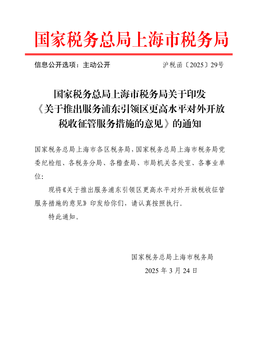 现将《关于推出服务浦东引领区更高水平对外开放税收征管服务措施的意见》印发给你们,请认真按照执行。