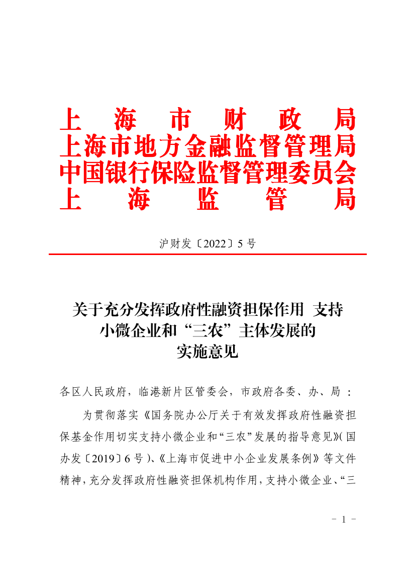 为贯彻落实《国务院办公厅关于有效发挥政府性融资担保基金作用切实支持小微企业和“三农”发展的指导意见》(国办发〔2019〕6号)、《上海市促进中小企业发展条例》等文件精神,充分发挥政府性融资担保机构作用,支持小微企业、“三农”和战略性新兴产业发展,经市政府同意,提出如下意见。