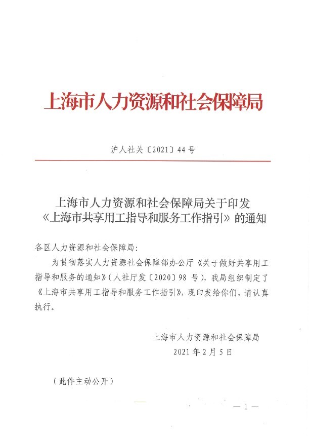 为贯彻落实人力资源社会保障部办公厅《关于做好共享用工指导和服务的通知》(人社厅发〔2020〕98号),我局组织制定了《上海市共享用工指导和服务工作指引》,现印发给你们,请认真执行。