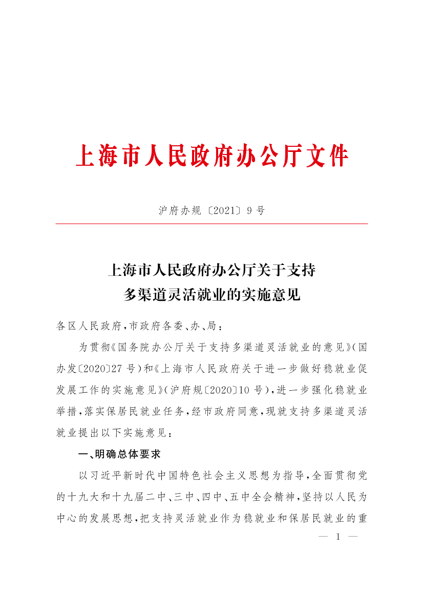 为贯彻《国务院办公厅关于支持多渠道灵活就业的意见》(国办发〔2020〕27号)和《上海市人民政府关于进一步做好稳就业促发展工作的实施意见》(沪府规〔2020〕10号),进一步强化稳就业举措,落实保居民就业任务,经市政府同意,现就支持多渠道灵活就业提出以下实施意见: