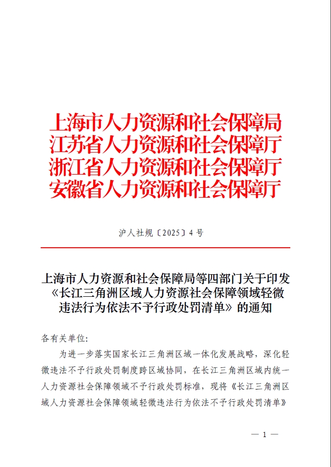 为进一步落实国家长江三角洲区域一体化发展战略,深化轻微违法不予行政处罚制度跨区域协同,在长江三角洲区域内统一人力资源社会保障领域不予行政处罚标准,现将《长江三角洲区域人力资源社会保障领域轻微违法行为依法不予行政处罚清单》印发给你们,请认真组织实施。