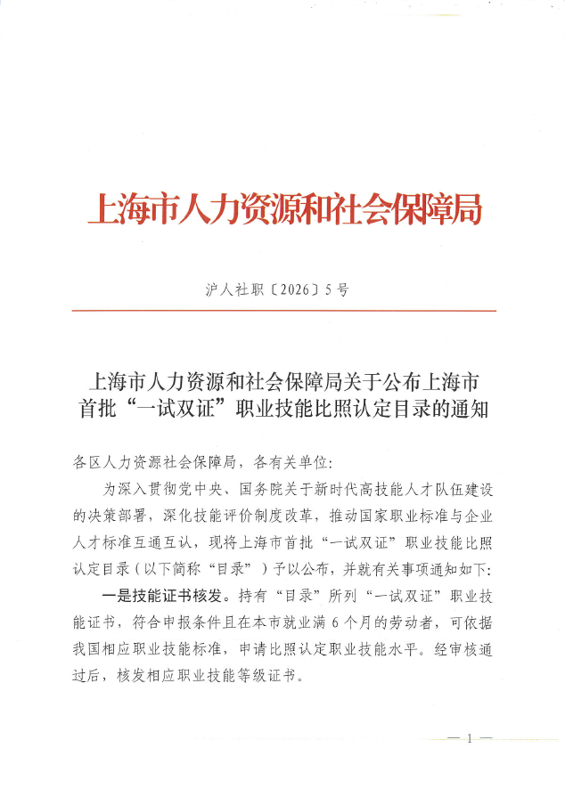 为深入贯彻党中央、国务院关于新时代高技能人才队伍建设的决策部署,深化技能评价制度改革,推动国家职业标准与企业人才标准互通互认,现将上海市首批“一试双证”职业技能比照认定目录(以下简称“目录”)予以公布,并就有关事项通知如下: