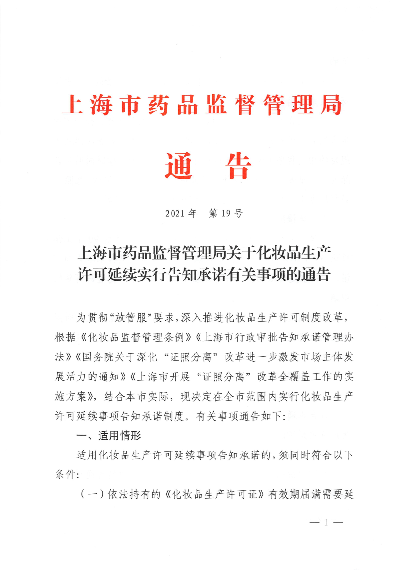 为贯彻“放管服”要求,深入推进化妆品生产许可制度改革,根据《化妆品监督管理条例》《上海市行政审批告知承诺管理办法》《国务院关于深化“证照分离”改革进一步激发市场主体发展活力的通知》《上海市开展“证照分离”改革全覆盖工作的实施方案》,结合本市实际,现决定在全市范围内实行化妆品生产许可延续事项告知承诺制度。有关事项通告如下:
