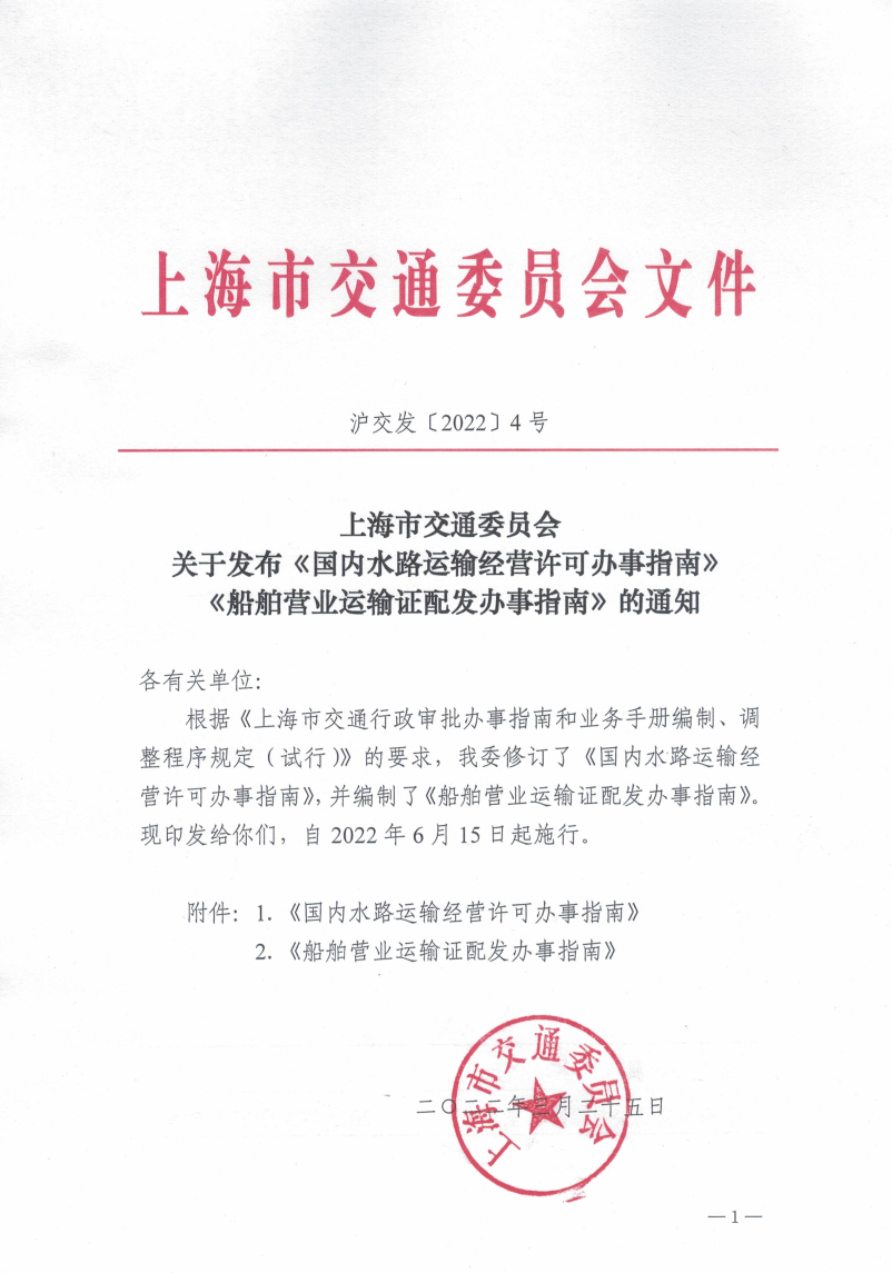 根据《上海市交通行政审批办事指南和业务手册编制、调整程序规定(试行)》的要求,我委修订了《国内水路运输经营许可办事指南》,并编制了《船舶营业运输证配发办事指南》。现印发给你们,自2022年6月15日起施行。