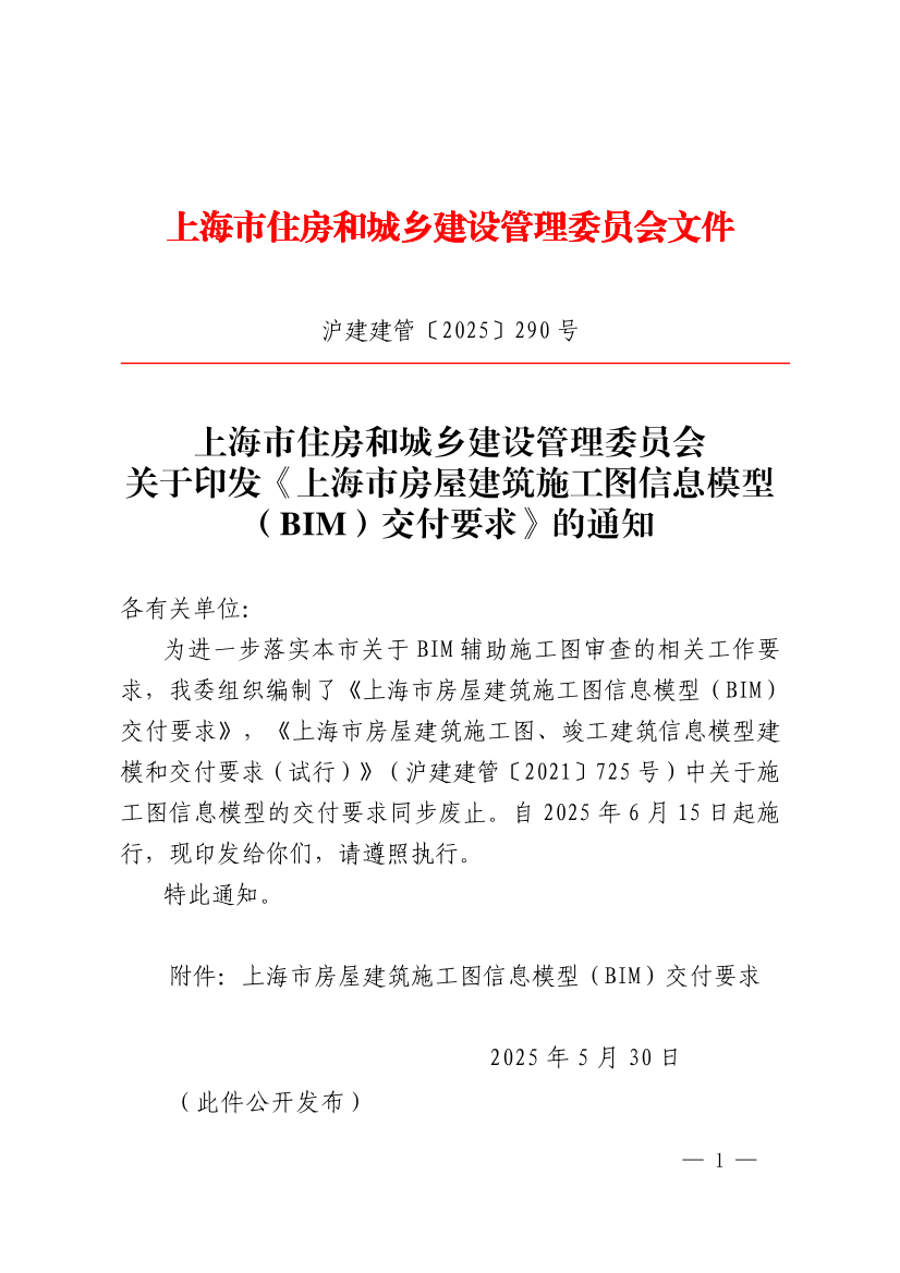 为进一步落实本市关于BIM辅助施工图审查的相关工作要求,我委组织编制了《上海市房屋建筑施工图信息模型(BIM)交付要求》,《上海市房屋建筑施工图、竣工建筑信息模型建模和交付要求(试行)》(沪建建管〔2021〕725号)中关于施工图信息模型的交付要求同步废止。自2025年6月15日起施行,现印发给你们,请遵照执行。