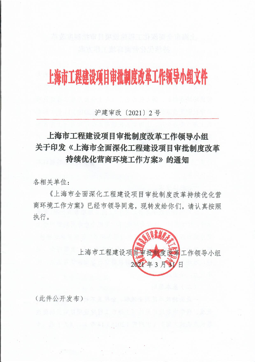 关于印发《上海市全面深化工程建设项目审批制度改革 持续优化营商环境工作方案》的通知