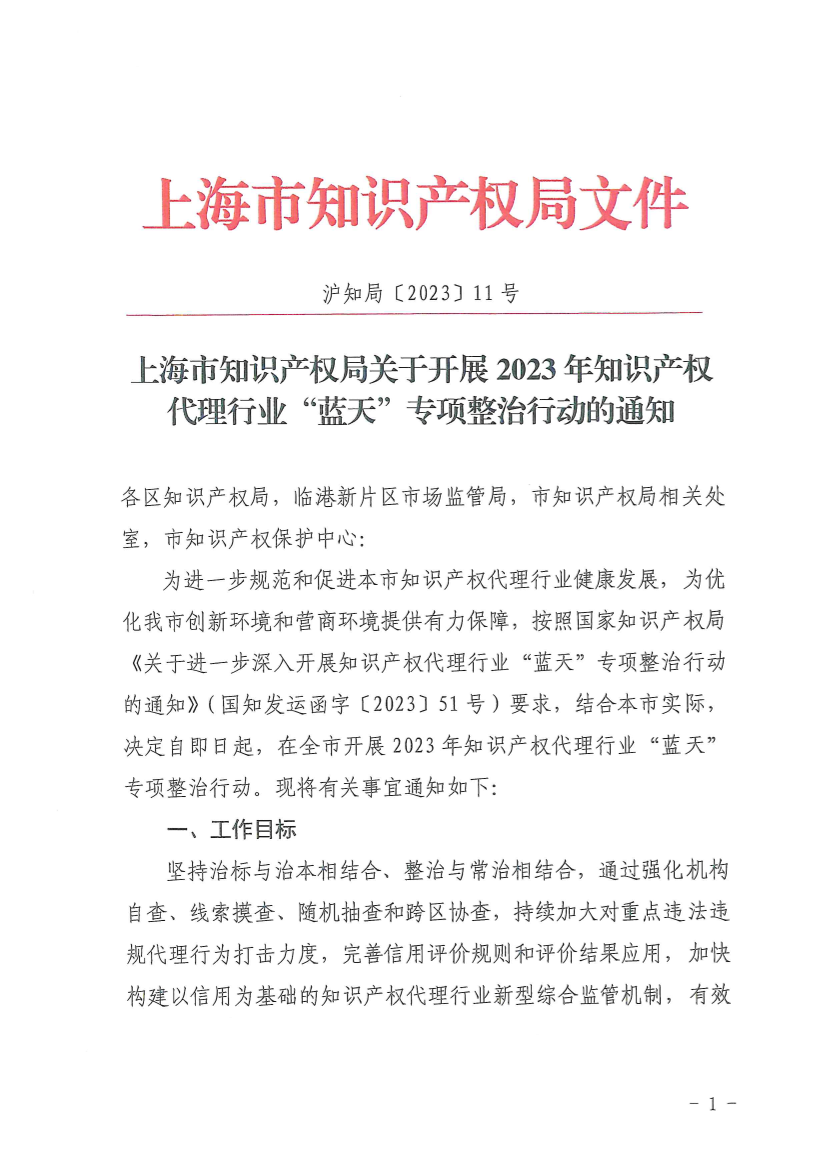 上海市知识产权局关于开展2023年知识产权代理行业“蓝天”专项整治行动的通知