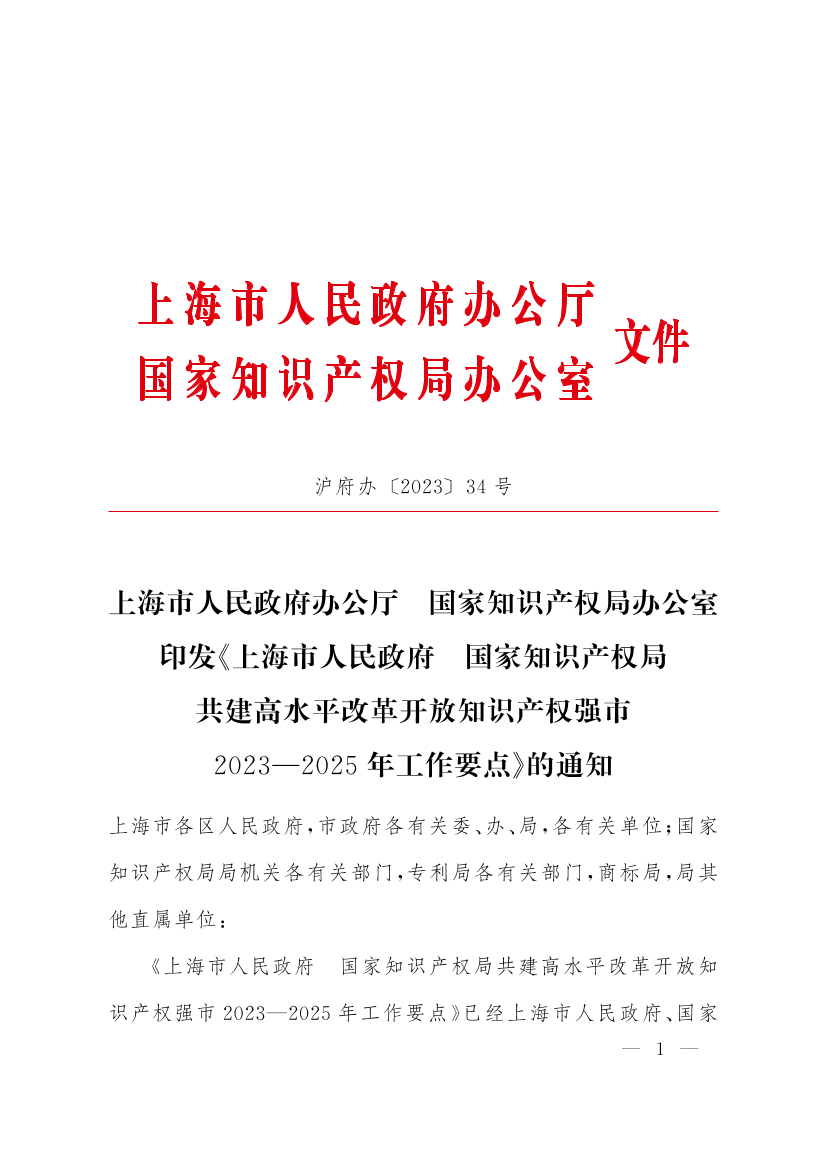 印发《上海市人民政府 国家知识产权局共建高水平改革开放知识产权强市2023—2025年工作要点》的通知