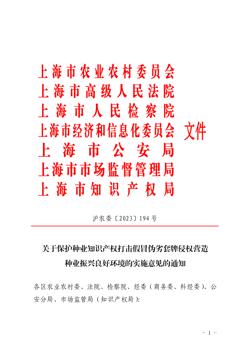 为深入贯彻落实农业农村部、最高人民法院、最高人民检察院、工业和信息化部、公安部、市场监管总局、国家知识产权局《关于保护种业知识产权打击假冒伪劣套牌侵权营造种业振兴良好环境的指导意见》(农种发〔2022〕2号),提高种业知识产权保护水平,严厉打击假冒伪劣、套牌侵权等违法犯罪行为,营造种业振兴良好环境,结合本市实际,提出以下实施意见。