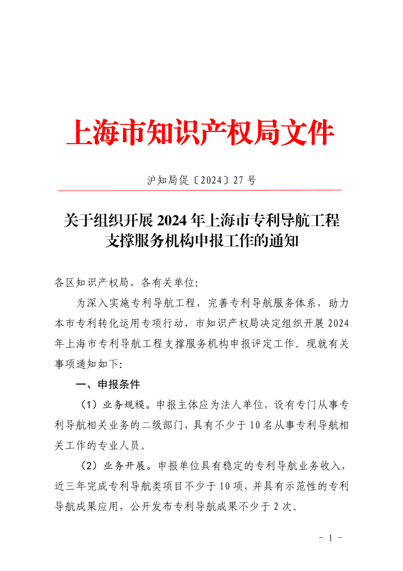 为深入实施专利导航工程,完善专利导航服务体系,助力本市专利转化运用专项行动,市知识产权局决定组织开展2024年上海市专利导航工程支撑服务机构申报评定工作。现就有关事项通知如下: