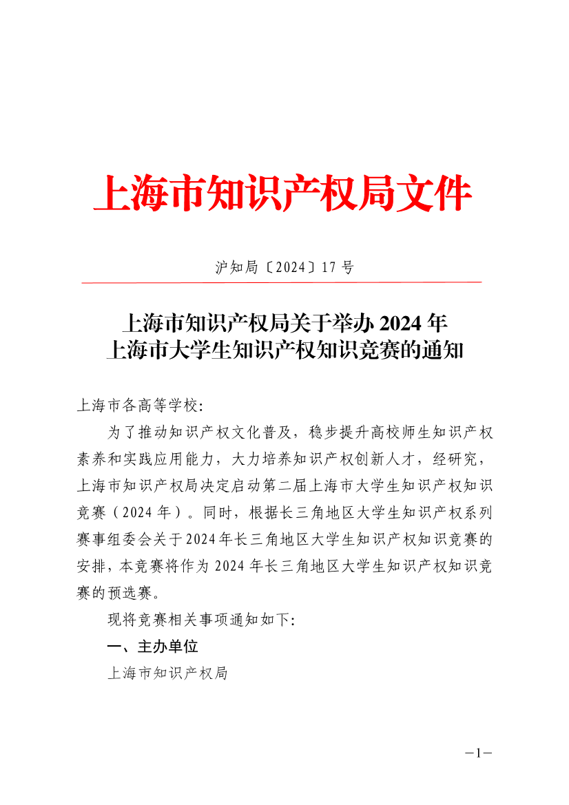 上海市知识产权局关于举办2024年上海市大学生知识产权知识竞赛的通知
