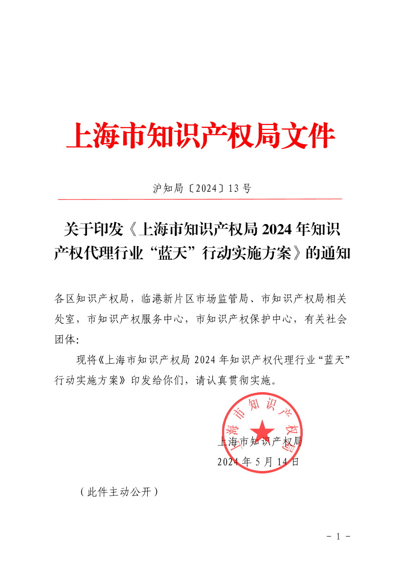 关于印发《上海市知识产权局2024年知识产权代理行业“蓝天”行动实施方案》的通知